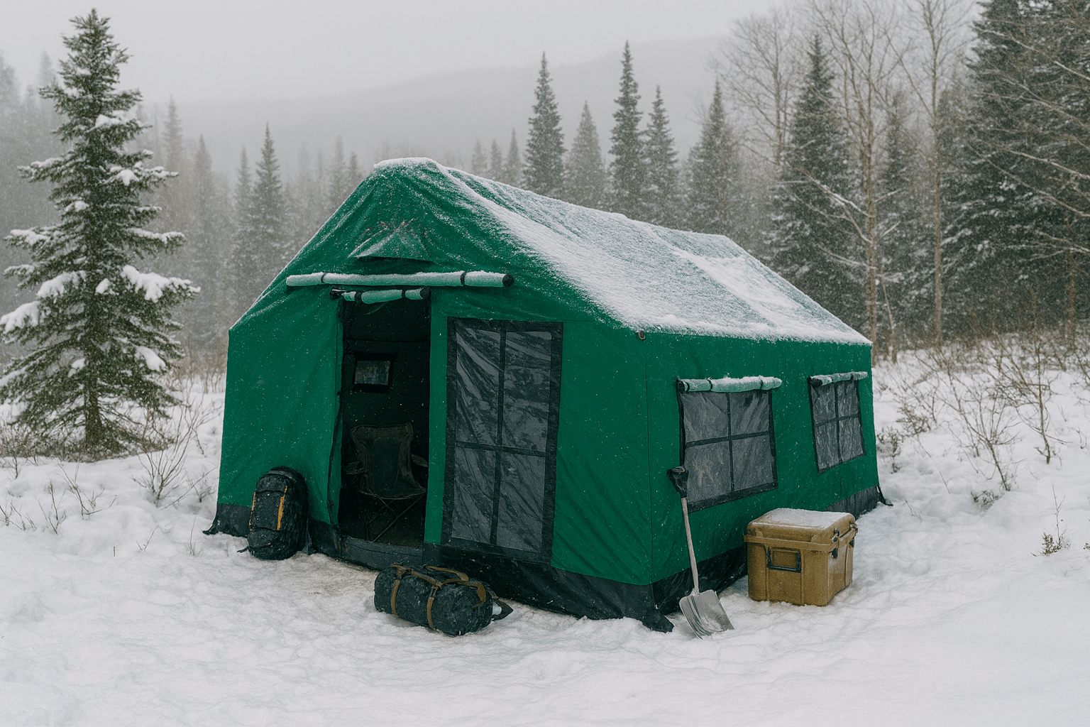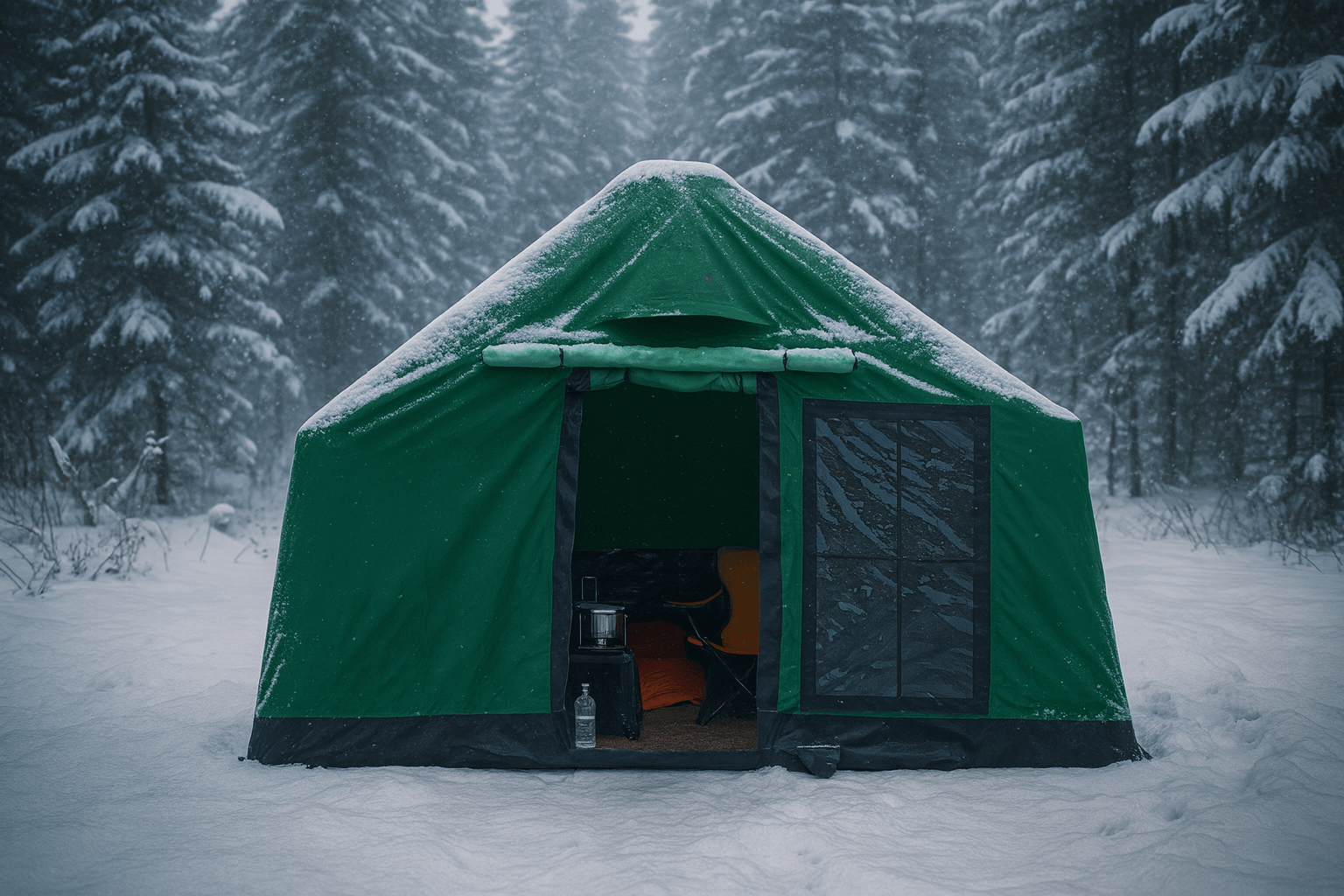 Fireproof Stove Mat (EXTRA OPTION): Fireproof mat designed for safe stove use inside the tent, protecting the floor by insulating it from the heat coming from the stove. Provides extra safety and comfort in cold weather.