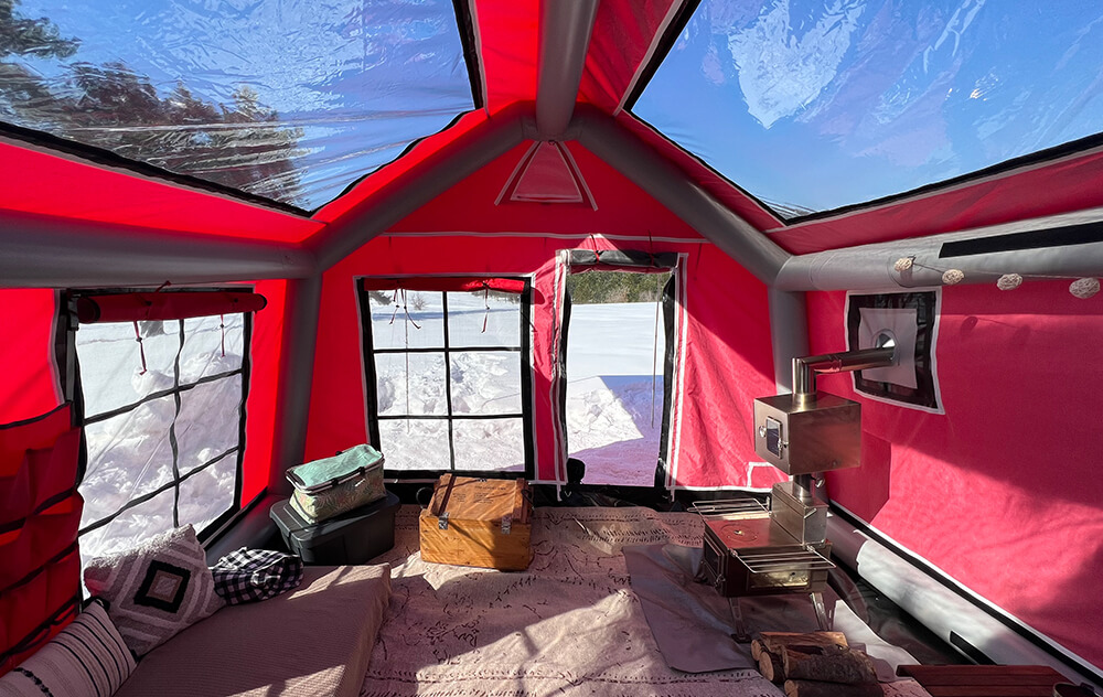 Fireproof Stove Mat (EXTRA OPTION): A fireproof mat designed to allow you to safely use a stove inside the tent, isolating the heat from the stove and protecting the ground. This adds extra safety and comfort during cold weather.