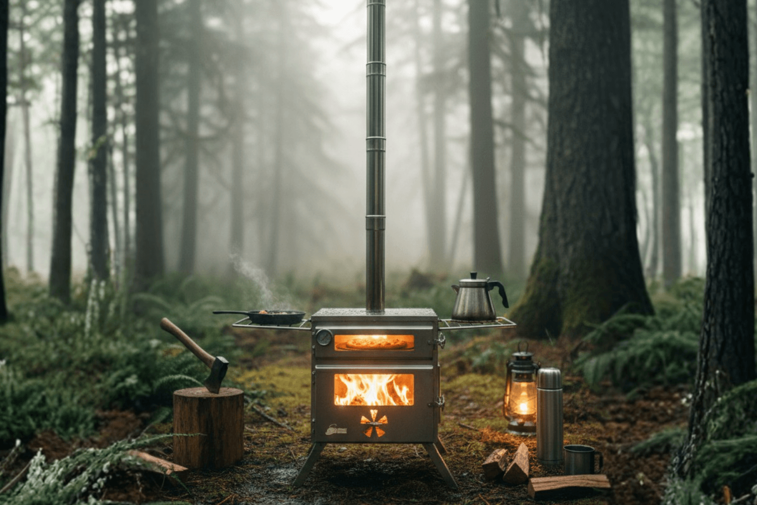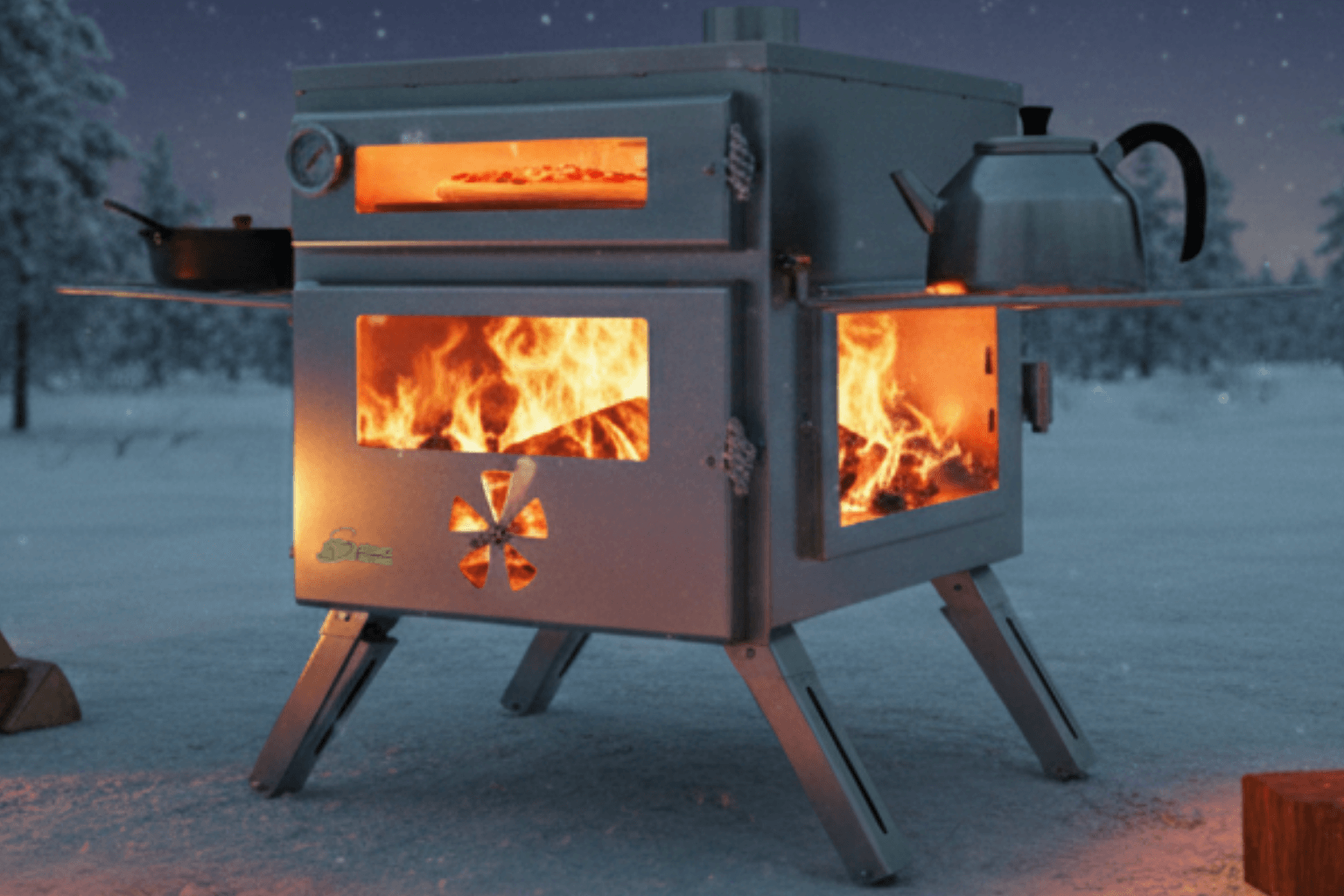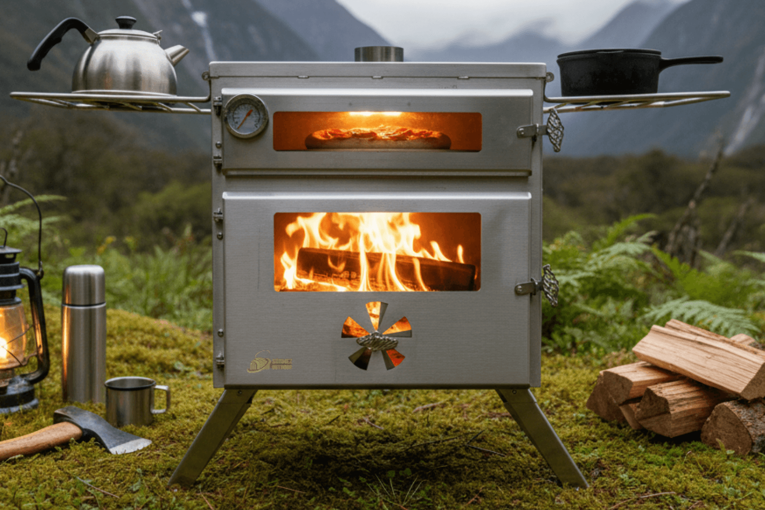 Featuring a spacious combustion chamber, front and side heat-resistant ceramic glass panels, and an integrated oven compartment on top, it provides both efficient heating and the ability to bake bread, pizza, pastries, and various dishes while camping. The side cooking racks allow you to brew tea and prepare meals simultaneously.