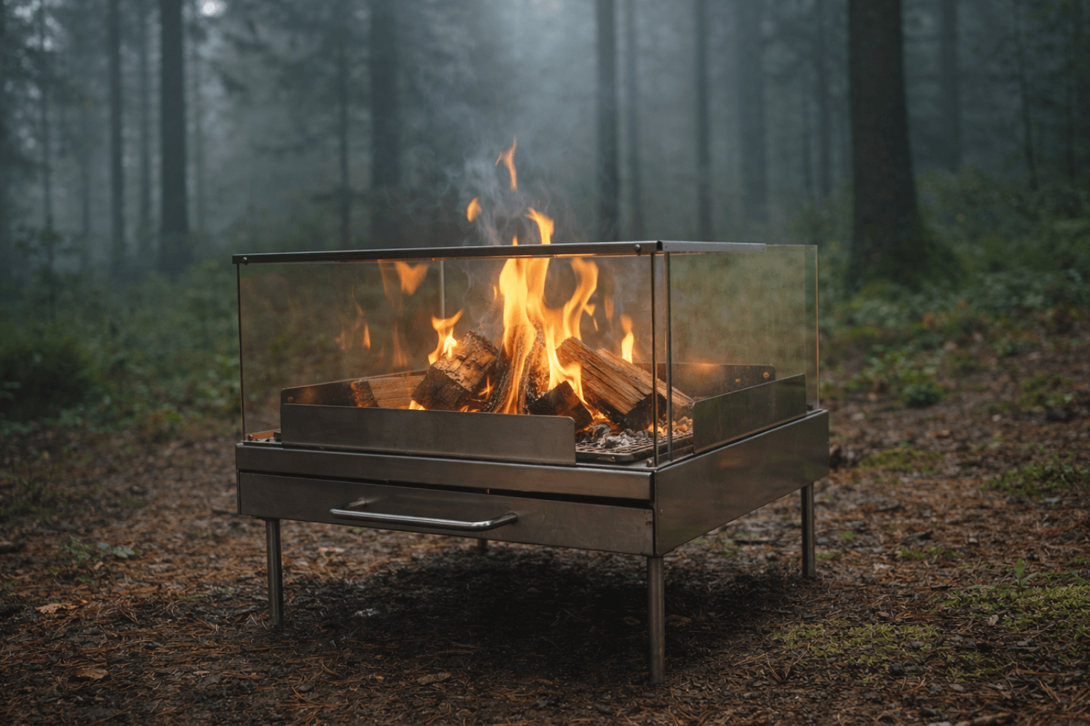 Designed for those looking for a stainless steel glass fire pit, the Stainless Steel Cube FireBox with Glass features glass protection on all four sides, providing a 360° view of the flames. Ideal for gardens, terraces, beaches, or outdoor settings, it creates a stylish atmosphere while offering a more controlled burning experience.